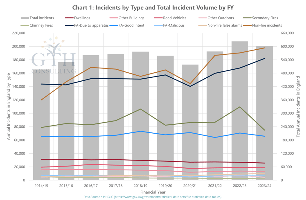 Total incidents in England are up 21% from 496,000 in 2014/15 to 600,000 in 2023/24 (based on the latest published stats from MHCLG).