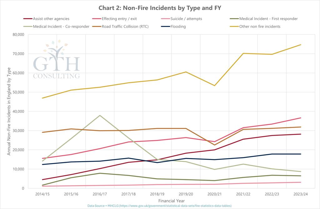 The most striking change is in non-fire incidents, up 66% over the same period. These now account for over 200,000 incidents annually (including non-fire false alarms).
