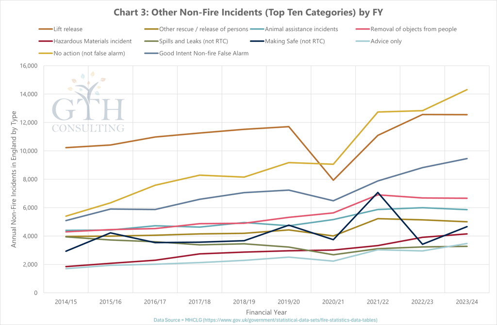 The ‘other non-fire’ sub-category captures a range of different incident types, and Chart 3 highlights changes in the ten most common.
