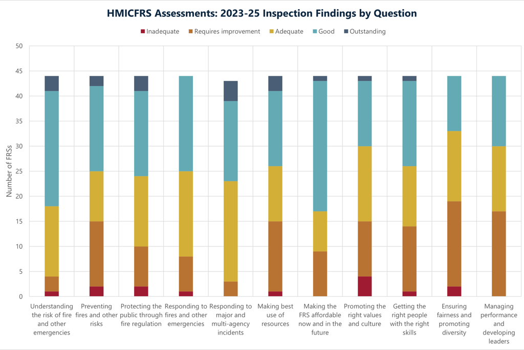 With HMICFRS recently having published the final reports from the 2023–25 round of Fire and Rescue Service (FRS) inspections (https://hmicfrs.justiceinspectorates.gov.uk/frs-assessments-year/2023-2025/), it feels like an appropriate moment to take stock. This latest set of reports gives us a national picture of performance, progress and persistent challenges across the sector, and allows some useful comparison with earlier inspection rounds.