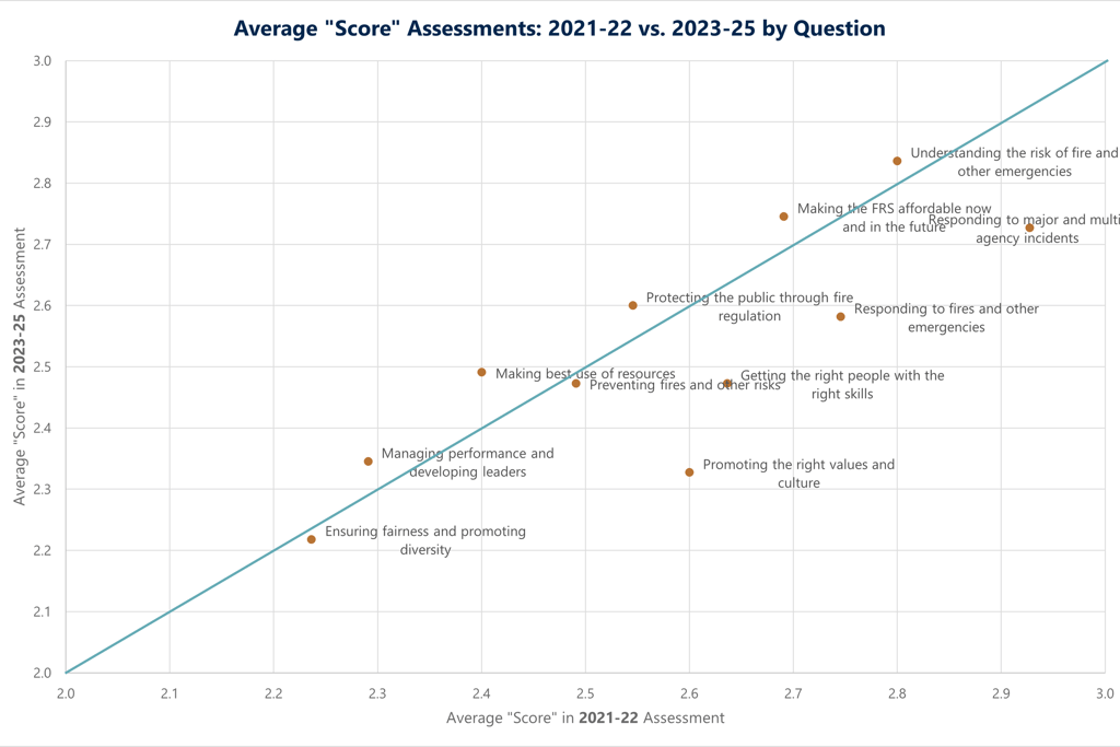 By assigning a score to each of the 44 FRSs across all eleven questions, and calculating a national average for each question, we can see which areas are typically stronger and which present more consistent challenges.